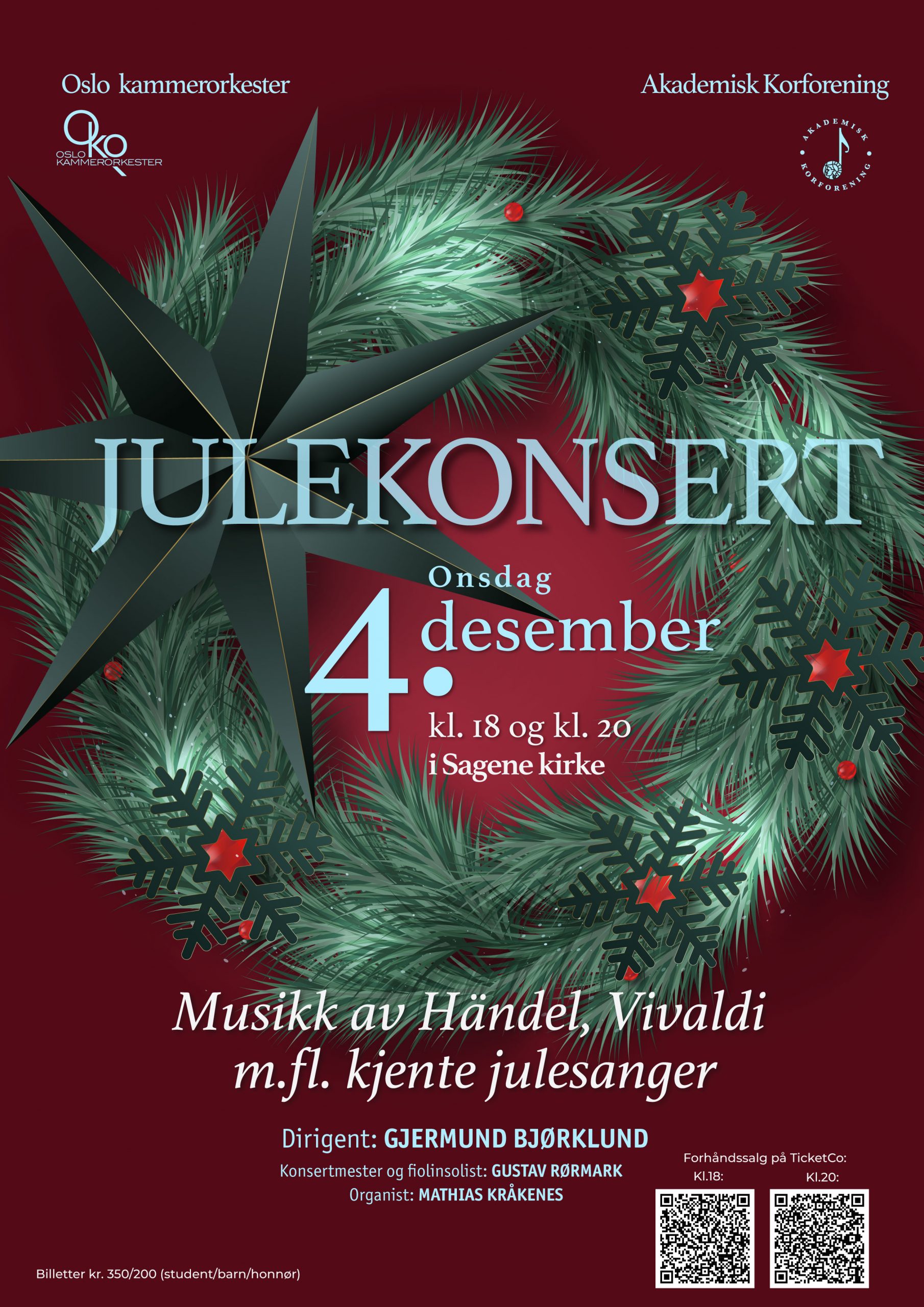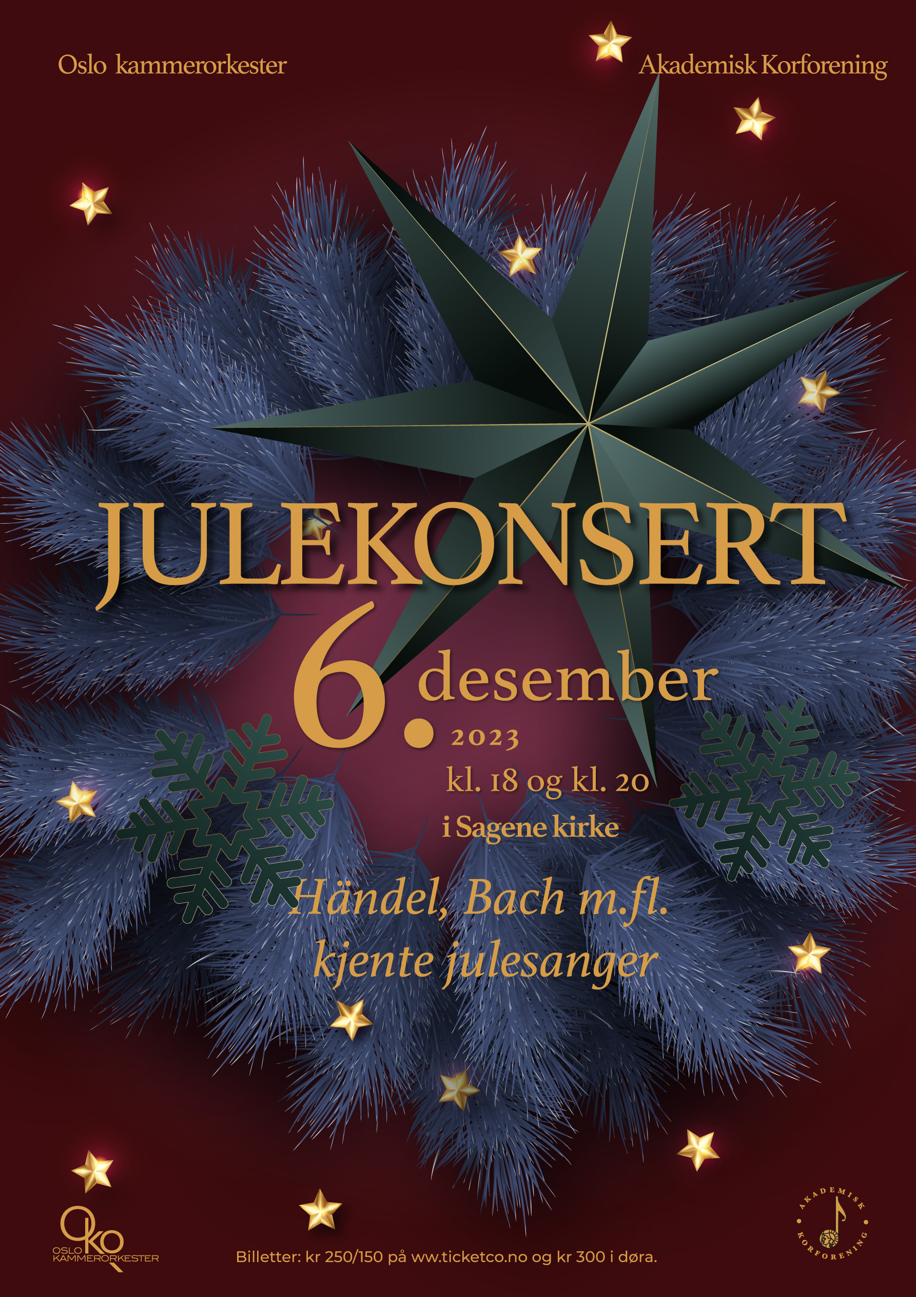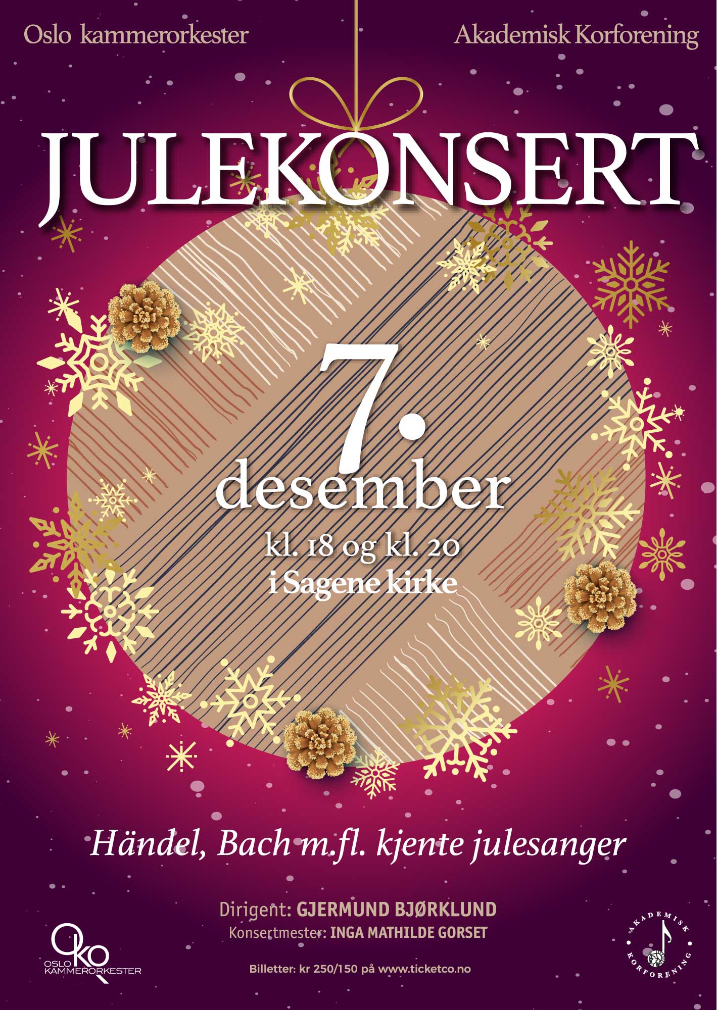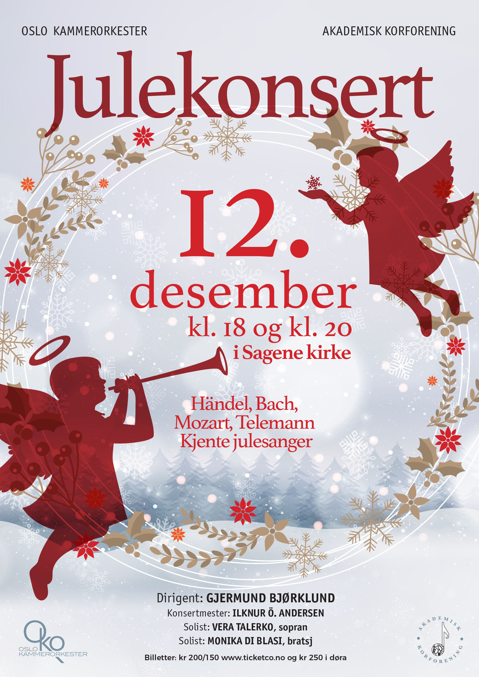 Tradisjonen tro holder vi to julekonserter med Oslo Kammerorkester i Sagene kirke. Årets to julekonserter blir onsdag 4. desember. Vi fyller kirken klokken 18 og klokken 20.