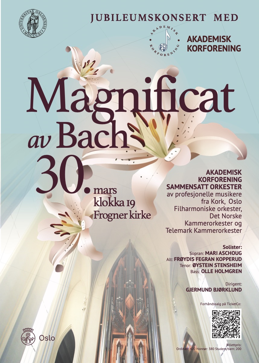 Velkommen til Akademisk korforenings jubileumskonsert, søndag 30.mars! Akademisk korforening feirer 95 år med en fantastisk konsert i Frogner kirke, sammen med et profesjonelt orkester og solister. Dere vil høre nydelige verk av Bach som “Magnificat” og “Der Geist hilfst Unser Schwachheit". Vi er sikre på at dette blir en flott konsert, og gleder oss til å dele denne musikkopplevelsen med dere!