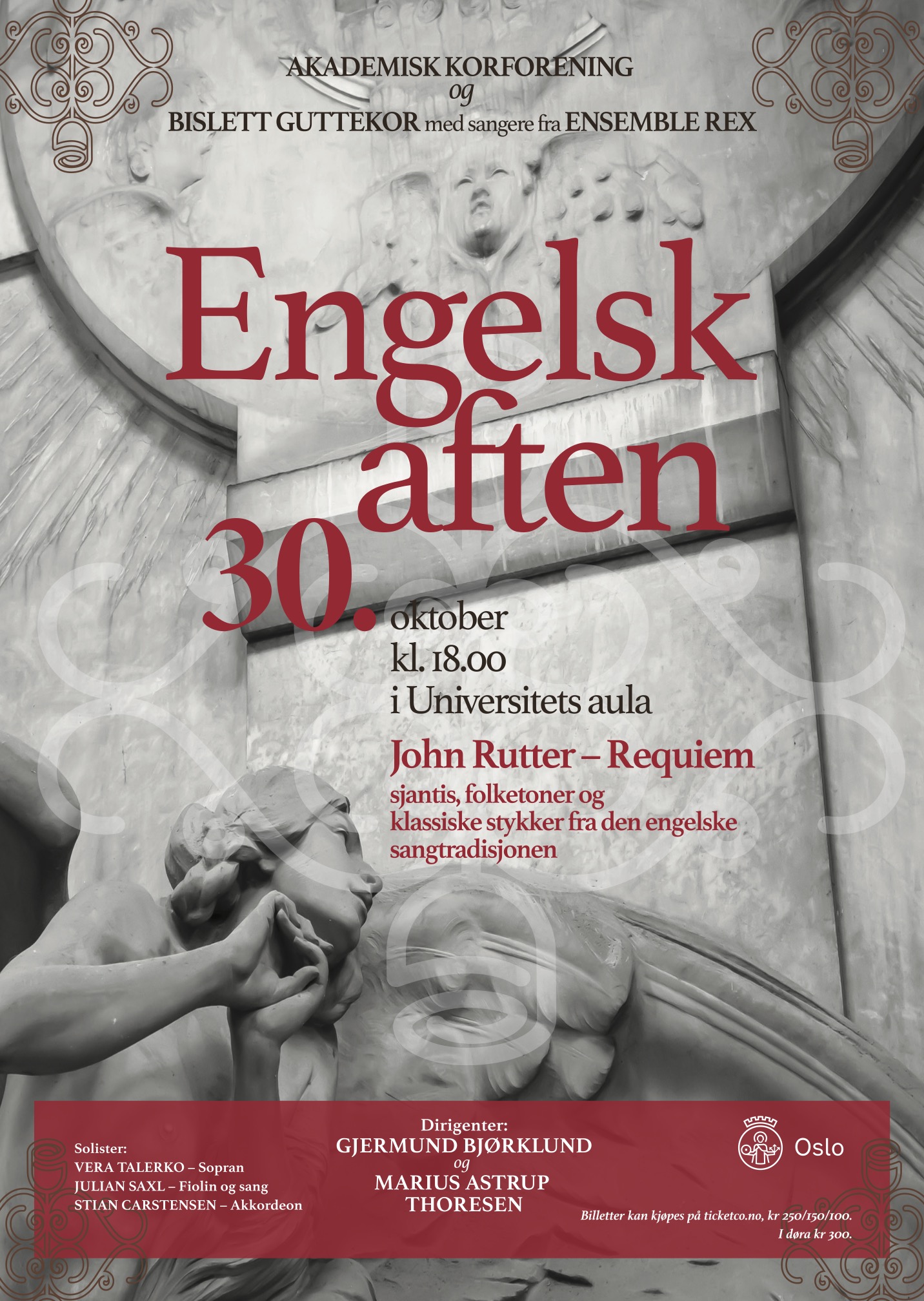 Søndag 30. oktober 2022 klokken 18.00 inviterer Akademisk Korforening og Bislett guttekor med sangere fra Ensemble Rex til engelsk aften i Universitetets Aula.