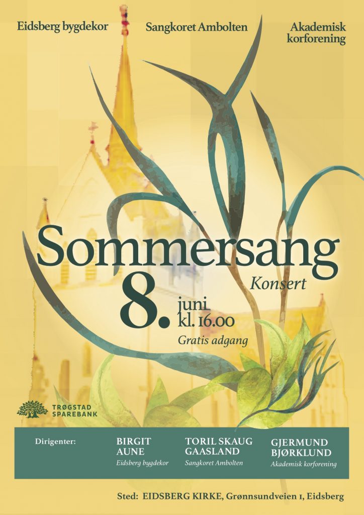 Lørdag 8. juni inviterer vi til årets sommerkonsert i Eidsberg kirke. Vi er så heldige å få opptre sammen med Eidsberg bygdekor og sangkoret Amboldet. Dette blir en vakker konsert med vår- og sommerlige verk på programmet.