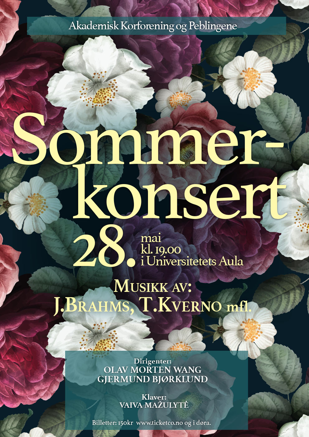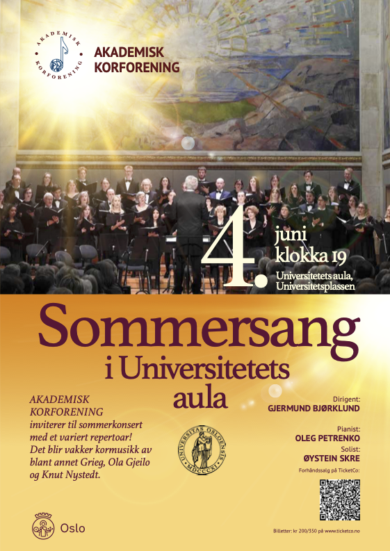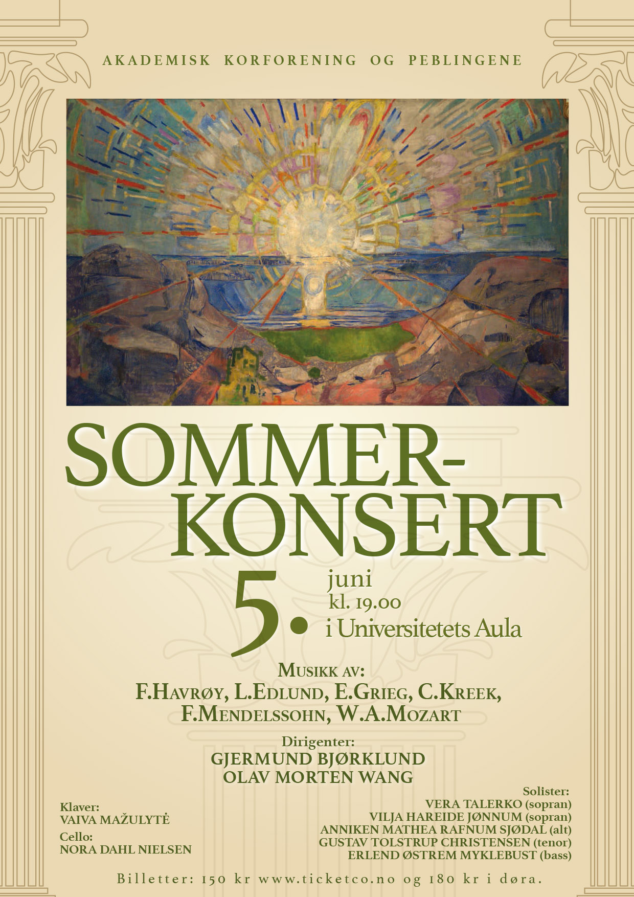 Akademisk Korforening, UiOs offisielle blandede kor, og Peblingene, Oslo katedralskoles kor, inviterer til årets sommerkonsert i Universitetets Aula. Vi fremfører et utvalg bestående av a cappella og akkompagnerte stykker. På programmet står verk for kor av T.Kverno, J.Brahms, M.Lauridsen, m.fl.Vi håper å kunne gi deg en fornøyelig aften, med kormusikk presentert i rammen av Edvard Munchs stemningsfulle bilder.