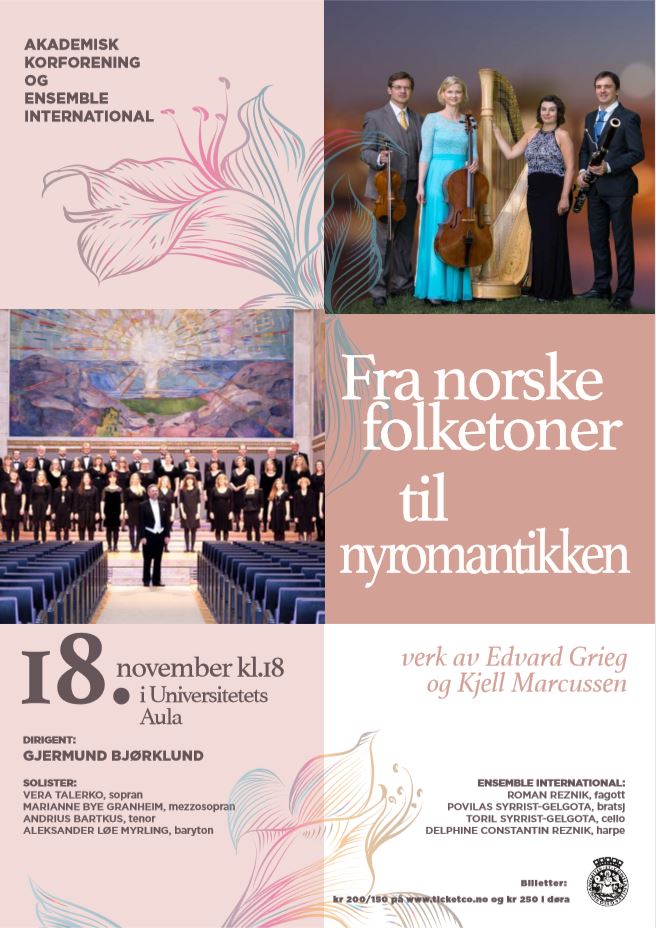 Akademisk korforening og Oslo kammerorkester fyller Universitetets vakre aula til en vårkonsert med verk av tre nålevende norske komponister: Ola Gjeilo, Kim André Arnesen og Terje Bjørklund. Det blir garantert en stemningsfull opplevelse.